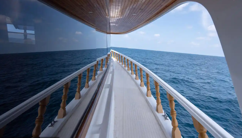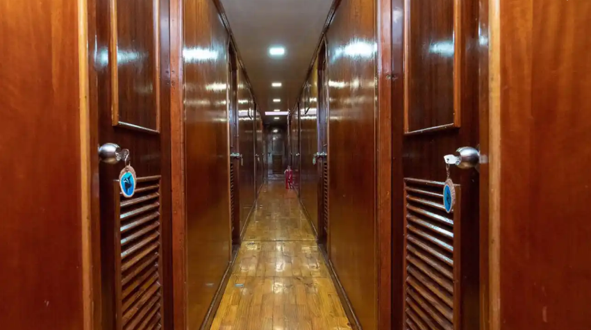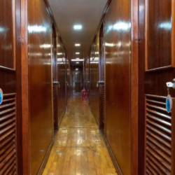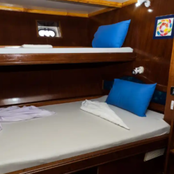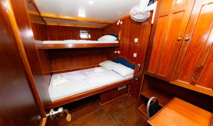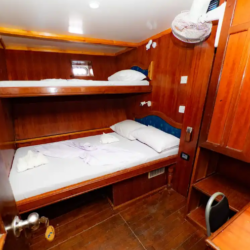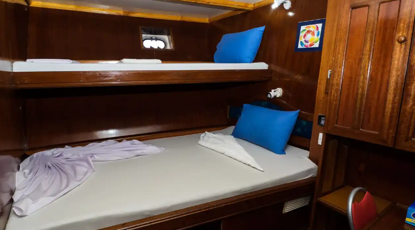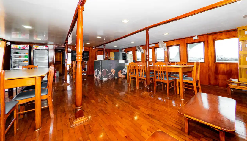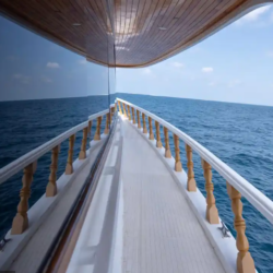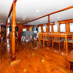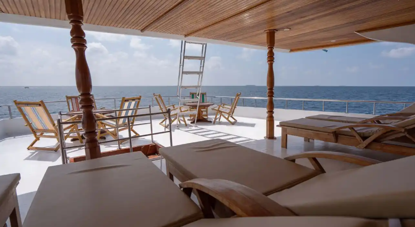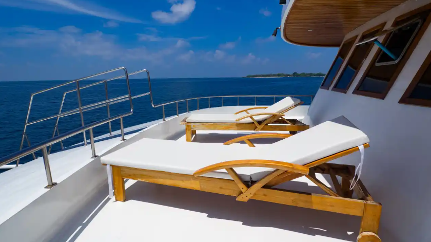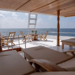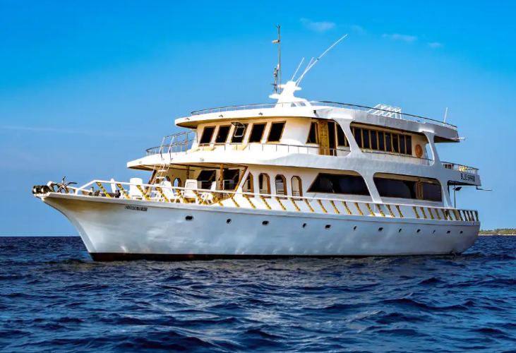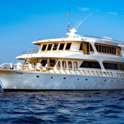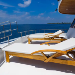 he 30m Blue Shark One yacht week-long dive liveaboard trips in the Maldives. She accommodates just 16 guests in 9 comfortable cabins. All cabins are located on the lower deck and come with a double plus single bed, individually controlled air-conditioning and en-suite bathroom. Social areas include the air-conditioned salon and dining room where 3 meals per day plus snacks will be served buffet-style. The cuisine is a mixture of international and Maldivian dishes, with a wide variety to suit everyone. The upper deck is home to the large sundeck and has cushioned loungers and beanbags for relaxing in between dives. Guests can also relax in a partially shaded outdoor lounge area. The crew of the Bue Shark One strives to be environmentally-friendly and offer guests refillable aluminium bottles, reusable bamboo straws and biodegradable toiletries in the bathrooms.